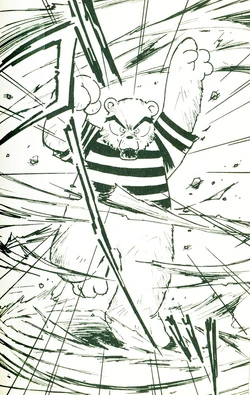 Caesar is a female bear with very thick eyebrows, sharp long fangs and a fierce expression on her face. She wears a yellow coat with black stripes and a brown spiked collar, which gaves her a more menacing appearence, however, Caesar has a big maternal instinct and is said she is the guardian of the kIds from the Warugaki Kindergarten.