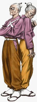 Oume & Otane are basically Oume Goketsuji and Otane Goketsuji with each other strapped to their backs, which is how they appeared in Groove On Fight. Since Oume decided to share the position of Clan Leader with Otane, this meant that both sisters would have to fight in the tournament together as one person, rather than fight separately. To make up for this, Falco was chosen to be their partner.